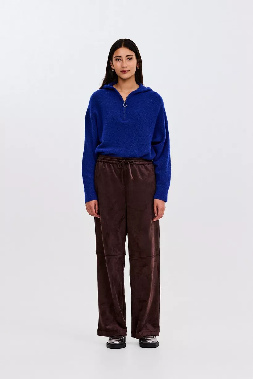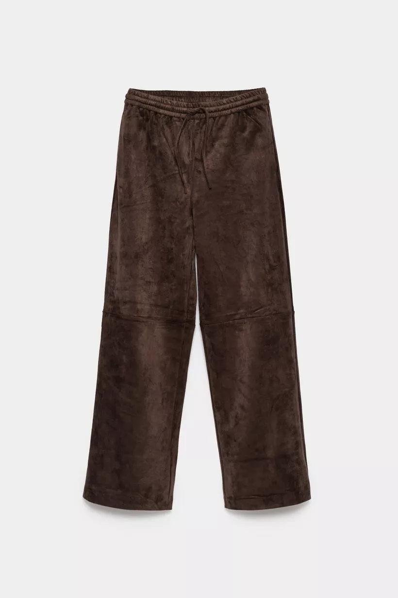Tendance à suivre ! Le daim est très en vogue cet hiver, et ce pantalon en daim marron foncé pour femme est donc un incontournable de votre garde-robe. Ce modèle présente des jambes droites et une taille élastique avec cordon de serrage pour un look décontracté. Veste assortie disponible.