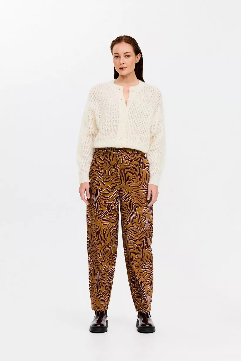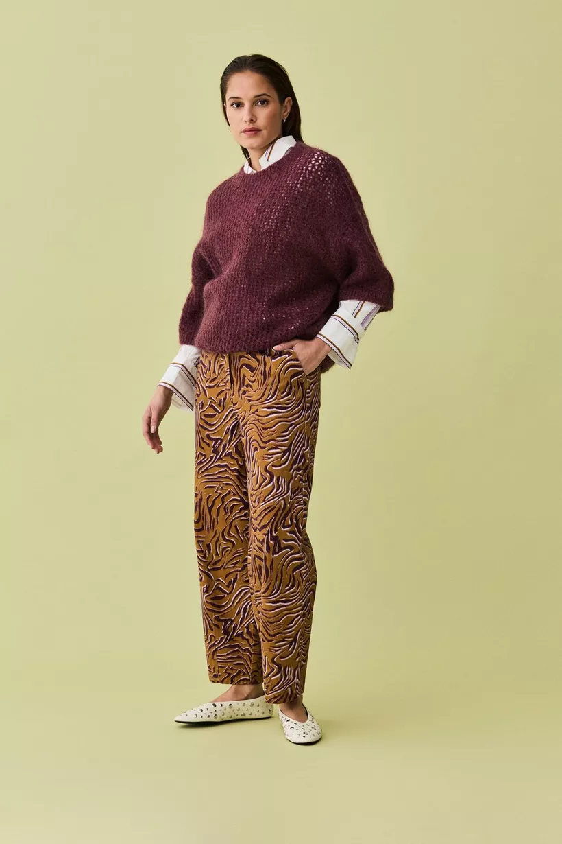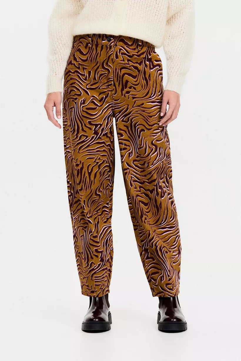 Libérez l'animal qui sommeille en vous avec ce jean barrel leg couleur moutarde pour femme. Ce pantalon à jambes arrondies présente une taille haute et un imprimé zèbre bordeaux pour un look tendance. Complétez votre look avec votre pull, votre sweat ou votre chemise préféré(e).