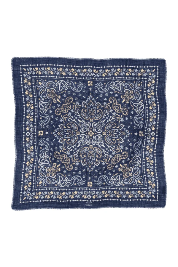La palette de ocre et de bleu crée un équilibre harmonieux, faisant de ce foulard une pièce captivante qui complète parfaitement votre garde-robe. Confectionné avec minutie en laine et soie de qualité supérieure, il offre une douceur luxueuse tout en vous enveloppant
