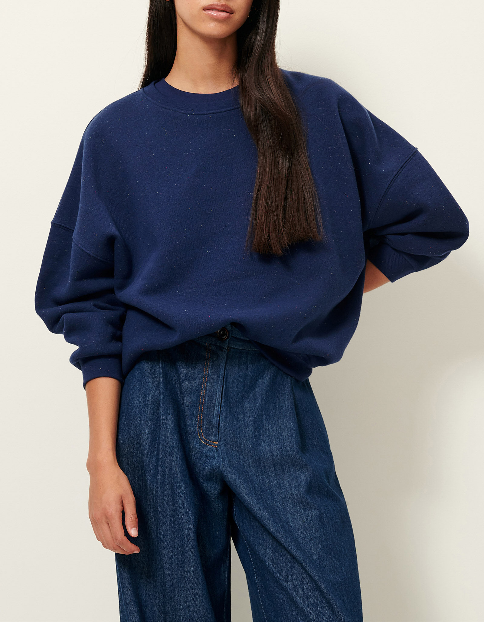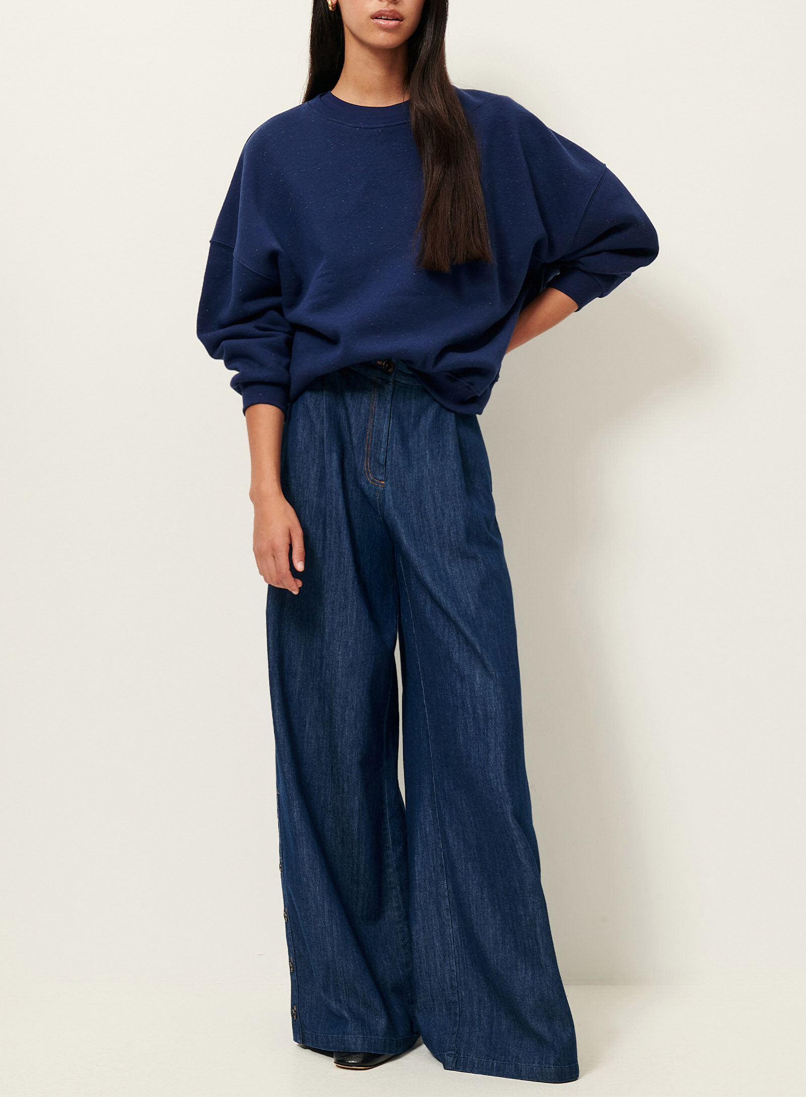 Sweat oversize en molleton chiné boutonné, confectionné au Portugal.