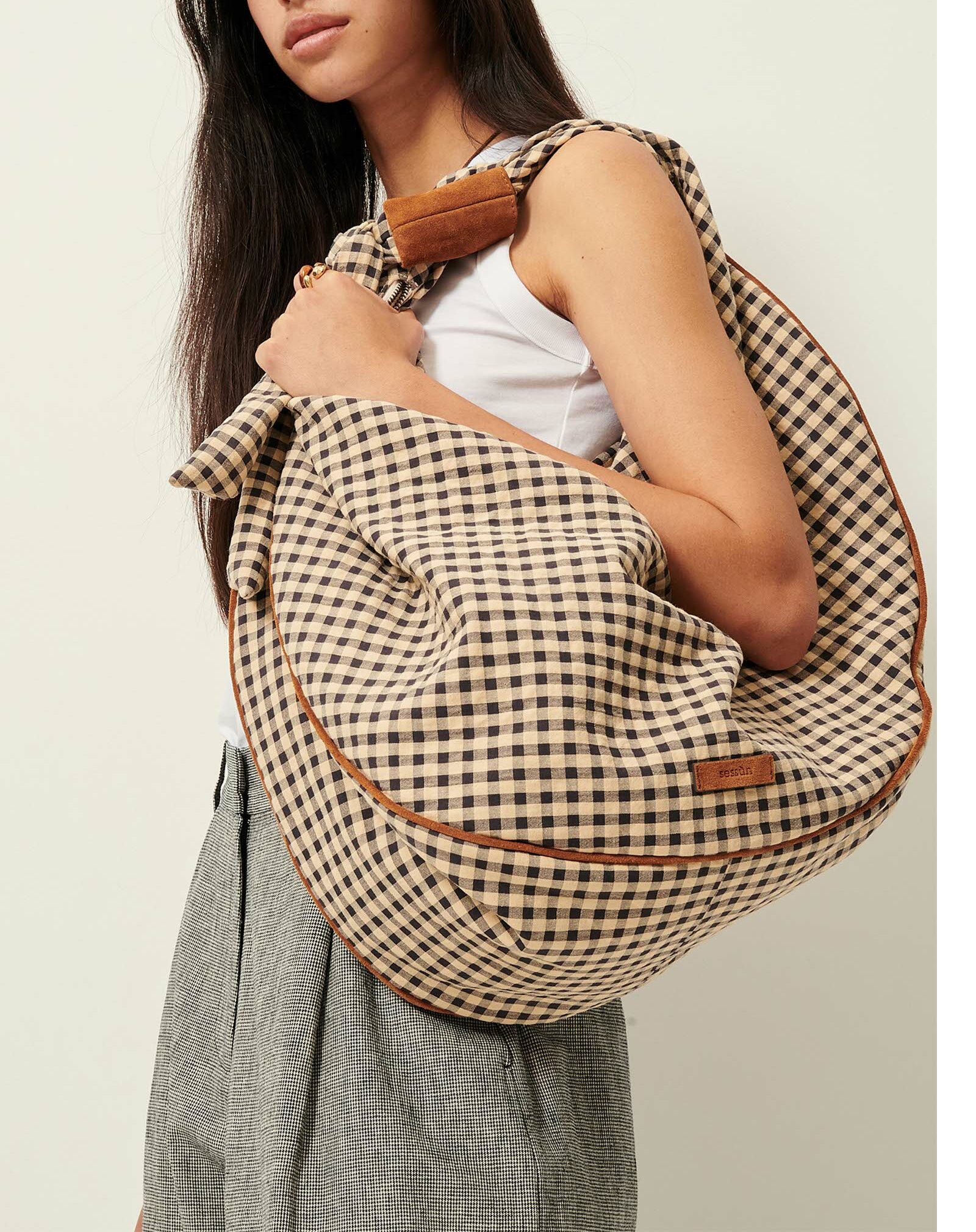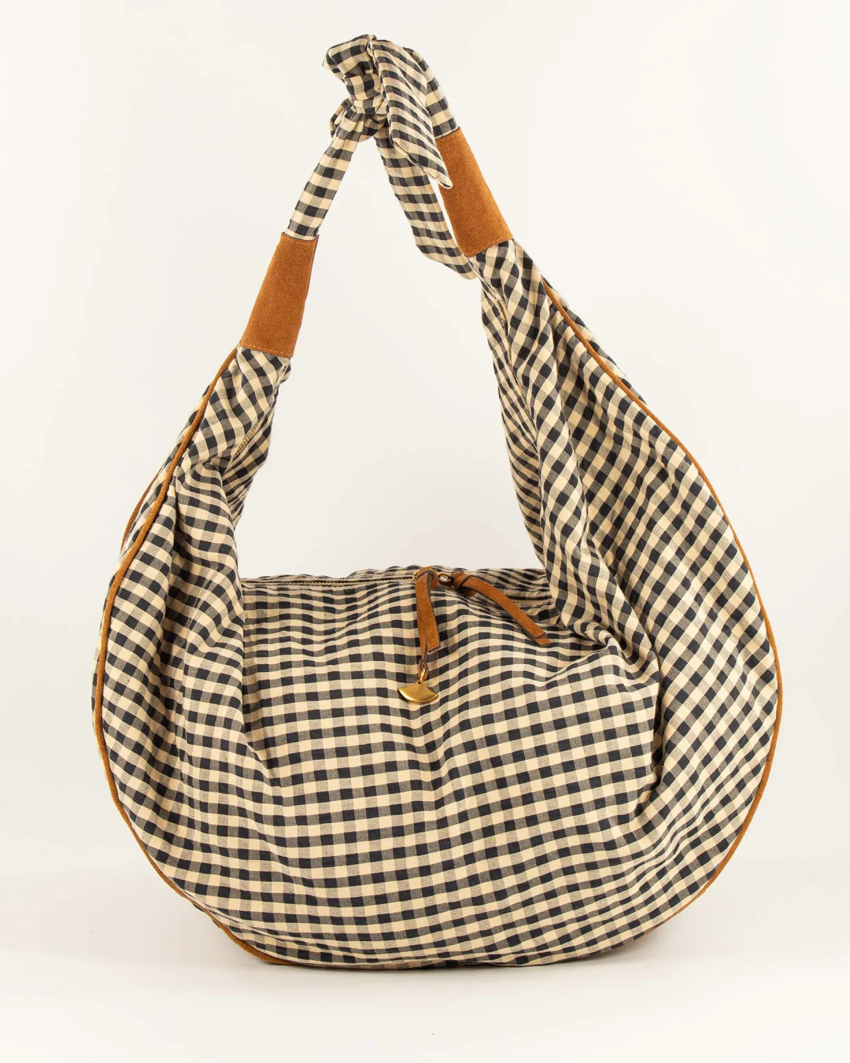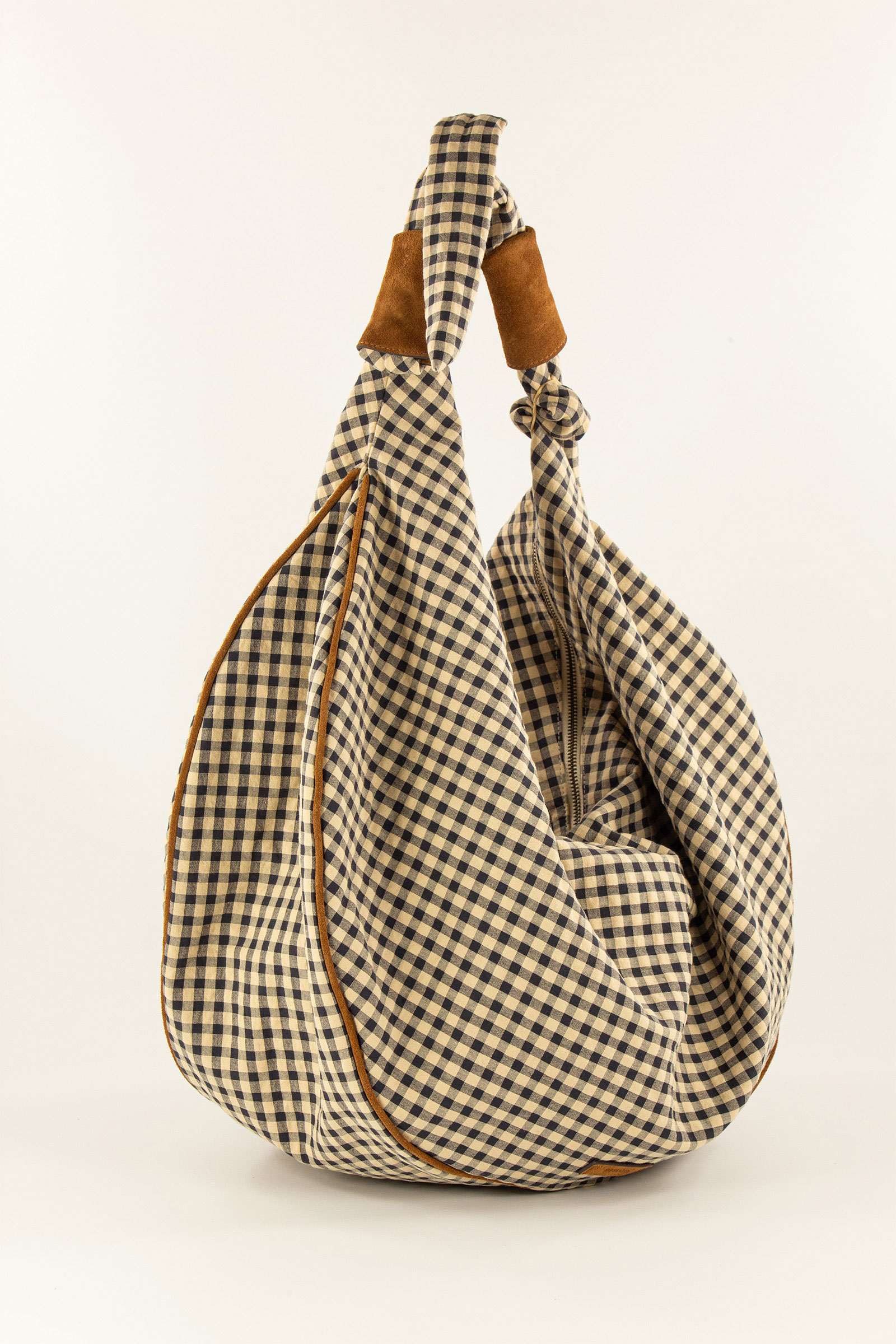 Large sac souple hobo en coton madras avec empiècements en cuir suédé de vache. Anse souple à nouer pour un porté croisé ou épaule. Fermeture zippée.